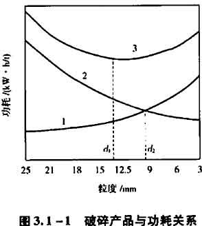 眾所周知,破碎作業(yè)產(chǎn)品粒度越細,所消耗的能量越高而此時磨礦作業(yè)的能耗越低,如圖3.1-1所示。從圖3.1-1可判斷總功耗比較低的大致粒度范圍為d1一d2。