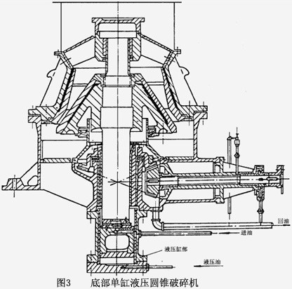 我國使用較多的為底部單缸液壓圓錐破碎機,其工作原理和彈簧圓錐破碎機相同,但在結構上取消了彈簧圓錐破碎機的調整環、支承環、鎖緊裝置以及球面軸承等零件。圖3為我國生產的底部單缸液壓圓錐破碎機的構造圖。該破碎機和彈簧圓錐破碎機的結構相類似,不同的是其調整和保險都是由支承在動錐的主軸底部的一個液壓缸和油壓系統來實現的。通過增加或減少液壓缸中的高壓油量就可使主軸和破碎錐上升或下降,從而達到排料口的調整。其原理見圖4所示。