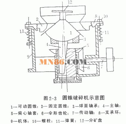 3、中、細碎圓錐破碎機的機架由上、下兩部分組成,用螺栓聯接,在螺栓上套有彈簧,借助附有手柄的鉸桿和鉸鏈,可使固定錐體上升或下降,從而調節排礦口的大小。旋回破碎機利用主軸上端螺帽調整懸掛可動錐體上下,從而調節排礦口的大小。