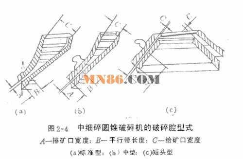 中碎和細碎圓錐破碎機的結構基本類似,只是標準型給礦口大,平行區短。短頭型給礦口小,平行區長。中型則居中。如圖